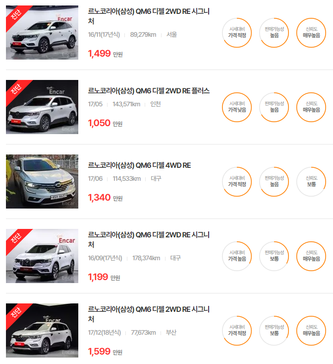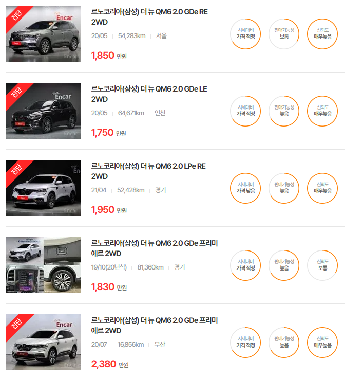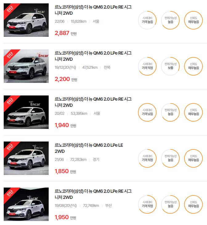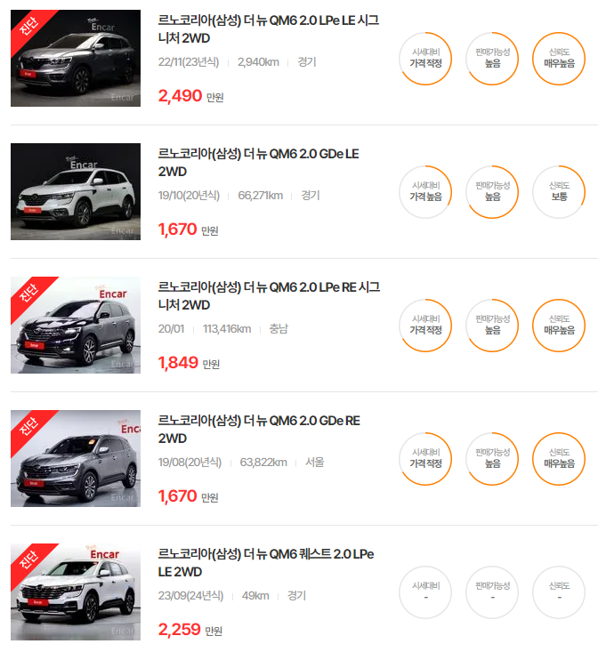 르노코리아 QM6는 SUV 시장에서 큰 인기를 끌고 있는 모델로, 연식에 따라 다양한 가격대가 형성되어 있습니다.