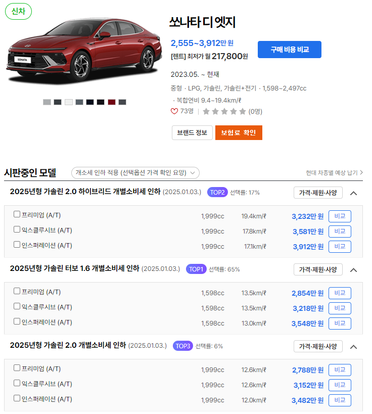 2025 쏘나타 하이브리드는 다양한 트림 옵션에서 높은 인기를 끌고 있습니다.