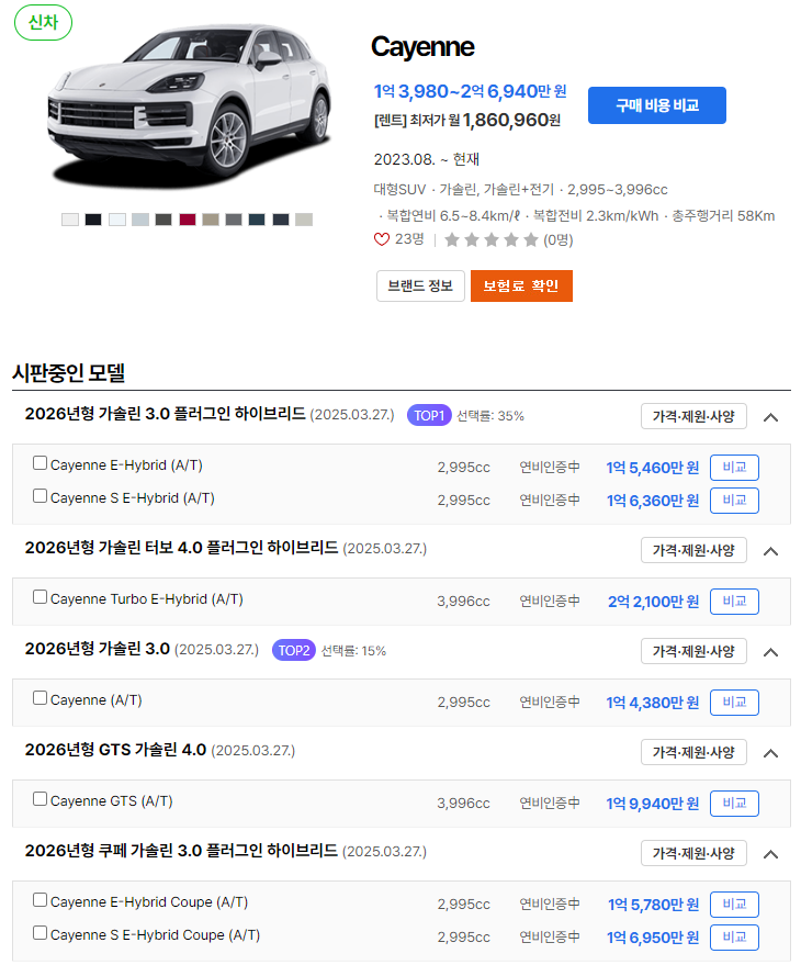 2026 포르쉐 카이엔은 다양한 트림과 옵션으로 구매 가능하며, 아래에 각 트림별 가격을 정리하였습니다: