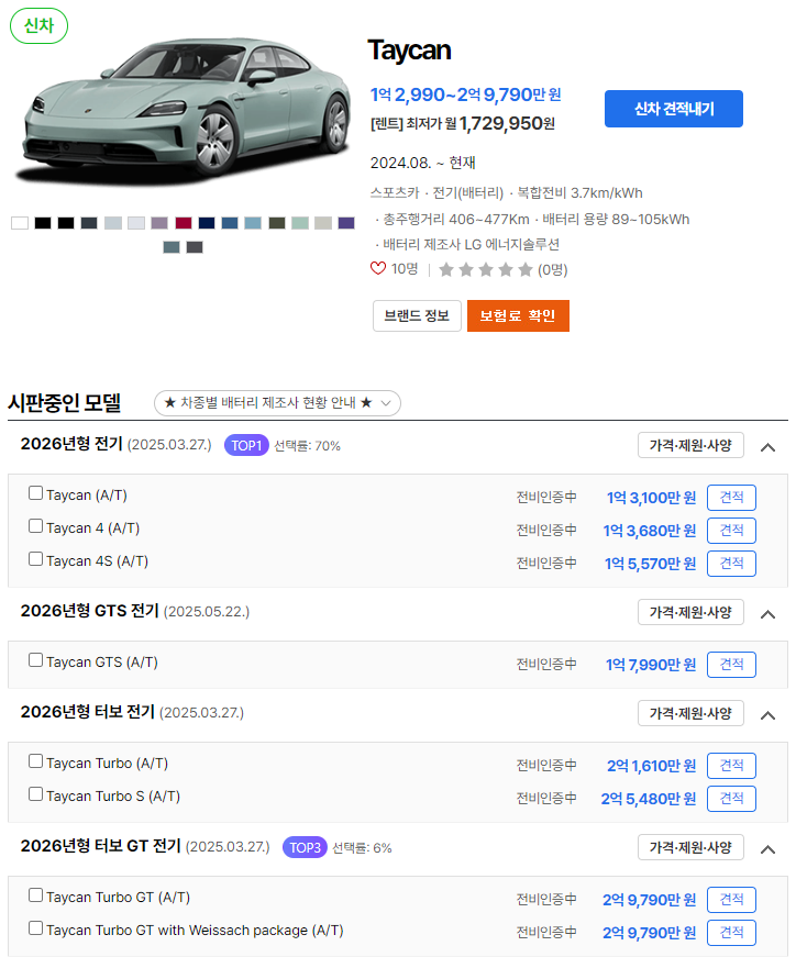 - Taycan (A/T): 1억 3,100만 원