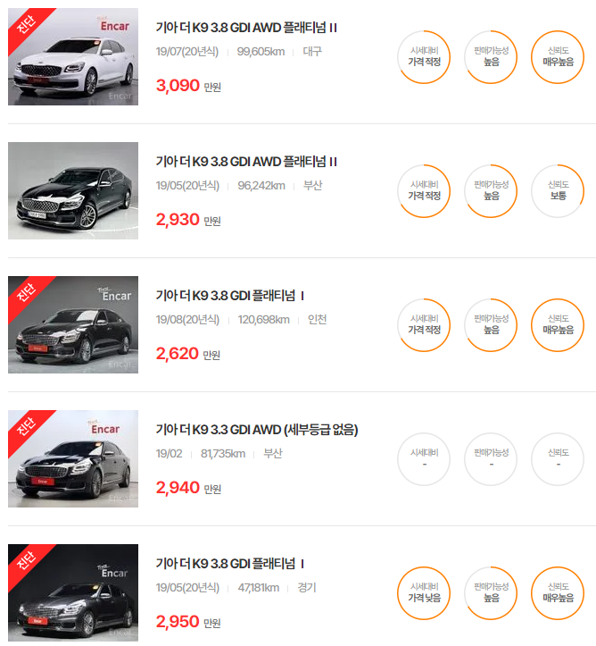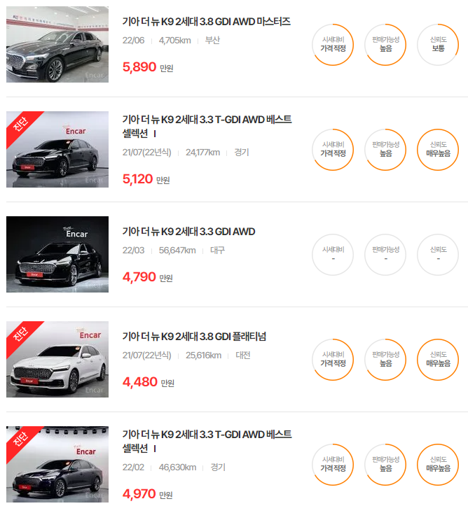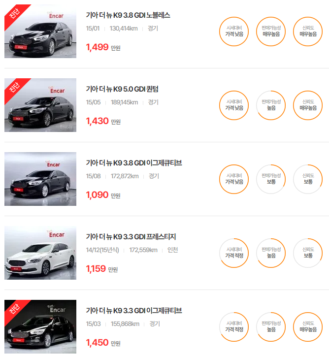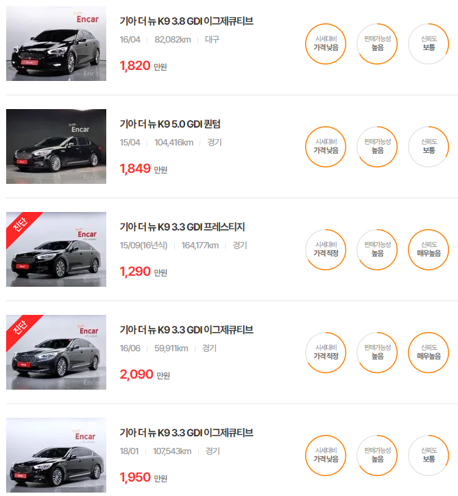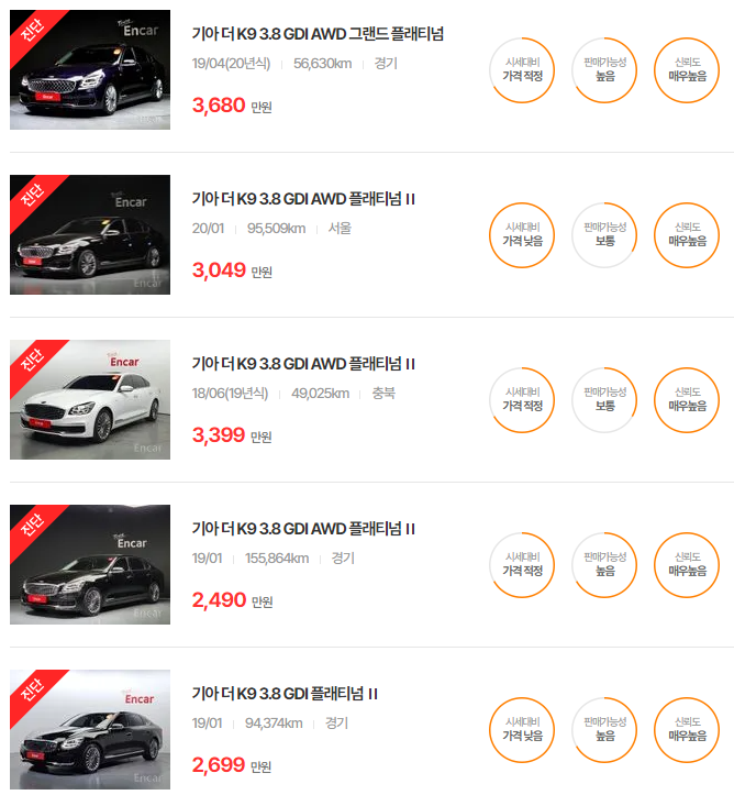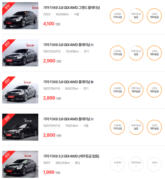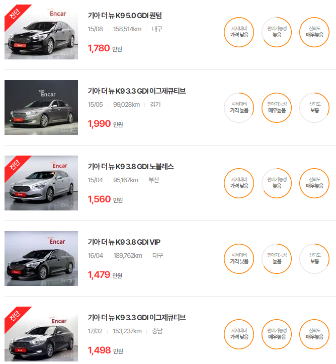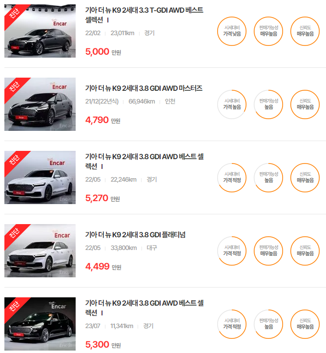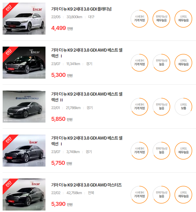 이 세대의 K9은 경제적인 면과 트림별 실용성이 중요시되고 있습니다. 옵션, 주행거리에 따라 가격이 달라질 수 있으며, 더 효율적인 연비를 제공합니다.