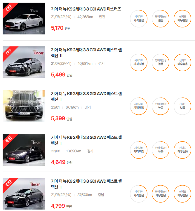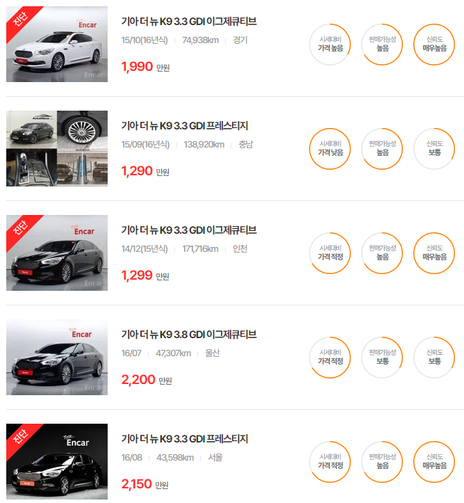 이 세대의 K9은 경제적인 면과 트림별 실용성이 중요시되고 있습니다. 옵션, 주행거리에 따라 가격이 달라질 수 있으며, 더 효율적인 연비를 제공합니다.